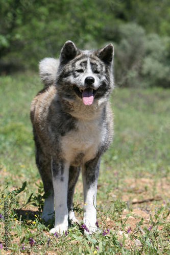 Grey Purebred Dog Breed Akita Inu Stuck Out His Tongue And Stares
